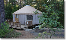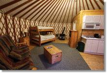 Yurt | 4-6 | $238 - $327 | Queen bed plus futon (sleeps 4), queen bed plus double/single bunk bed (sleeps 5), or queen bed, futon, and bunk bed (sleeps 6); private bathroomn, kitchenette |