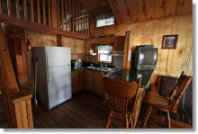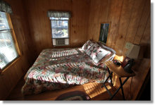 The family cabins sleep six via a futon couch in the main room, a queen bed in a bedroom in the back of the cabin, and a small loft, which was equipped with an air mattress in the unit I toured. These cabins include most of the accoutrements of a standard kitchen - stove and oven, microwave, full-sized refrigerator, sink, coffee maker, and microwave. You'll need to look somewhere other than Buck Meadows to stock the kitchen, though - possibly at the grocery store in Groveland, 10 miles west.