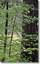 The flower bracts start with a greenish tint, but turn white by the time the actual flowers start to blossom. You may find dogwoods with pink blooms on the grounds of the Ahwahnee Hotel, but these are ringers, smuggled in from a nursery elsewhere.