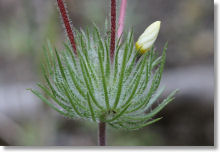Mustang Clover flowers exhibit a pleasing amount of variety, with colors ranging from white to pale lavender to a darker pinkish hue. The Mustang Clovers in the Hite Cove area tend to have a single purple spot at the base of each petal (see the photo above), while the ones along Lewis Creek typically have purple bands going all the way around the base of the corolla instead - though the "Flower Cluster" photo below, taken along the Lewis Creek trail, includes a mix of bands and very faint spots on a single plant. One thing that's usually not variable is the hairy cluster of spiky leaves from which the flower stems sprout (photo below), similar to the arrangement on Whisker Brush, another recent evacuee from the Linanthus genus. These are reliably green.