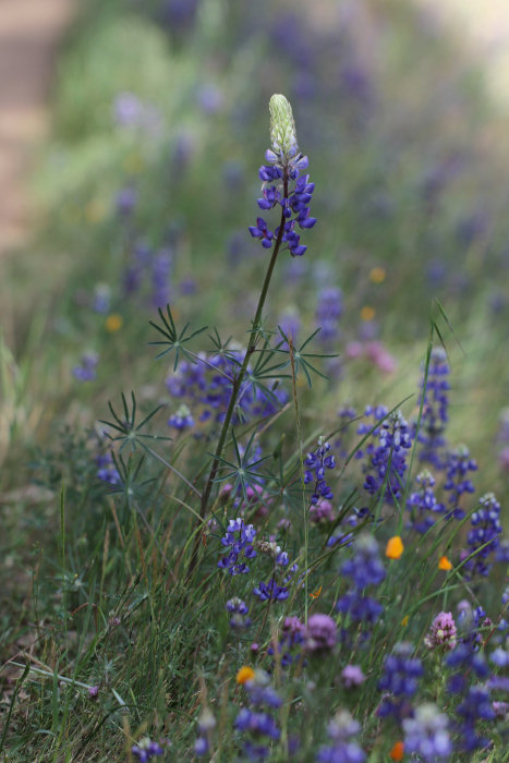 With about twenty varieties of purple lupine growing in the Yosemite area, you can be forgiven for spotting one and not classifying it beyond the basic "that's lupinus, the pivotal genus in Monty Python's Dennis Moore sketch" that would be apparent to virtually anyone. With Spider Lupine, though, and its unique combination of range and size, you actually have a chance of nailing the species. Spider Lupine is a foothill flower, not growing much above 2,000 feet elevation, and at up to three feet tall, it towers over most other lupines in its area (note how it compares to the Sky Lupines surrounding it in the plant photo below). In short, if you see a tall lupine along the Hite Cove trail or in the Merced River Canyon and it's a single stem rather than a bush, you can be fairly certain it's Spider Lupine.