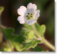 Varied-Leaf Nemophila has tiny flowers, smaller around than a dime, but they grow in clusters and make up in quantity what they lack in girth. The plant grows in the lower reaches of Yosemite and in the surrounding foothills of the western slope. It favors semi-shady areas, such as at the base of a rock or log.